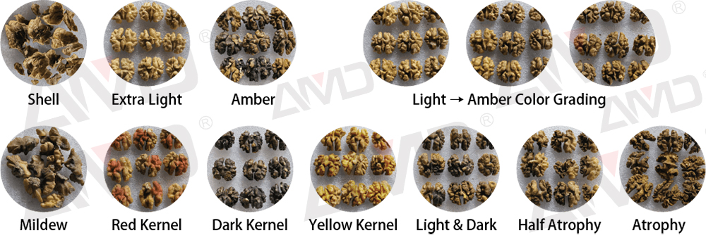 Rimuove efficacemente noci difettose come noci raggrinzite, rosse, blu, nere, ammuffite, filigranate, macchiate di nero, residui di setto, gherigli nel guscio, frammenti di guscio o gusci aderenti.